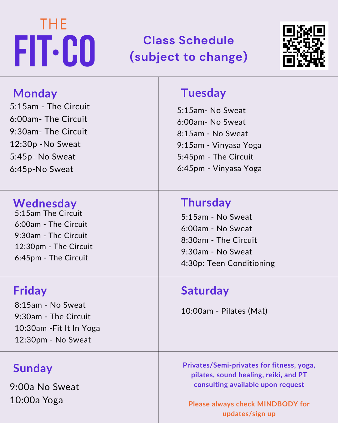 Vinyasa Flow Open: Our founder's favorite form of yoga which is a unique combination of flow, movement, stretch and mind body connection. It is a perfect way to work the body in conjunction with our signature No Sweat and HIIT classes. All levels welcome as we will move in connection with our breath.